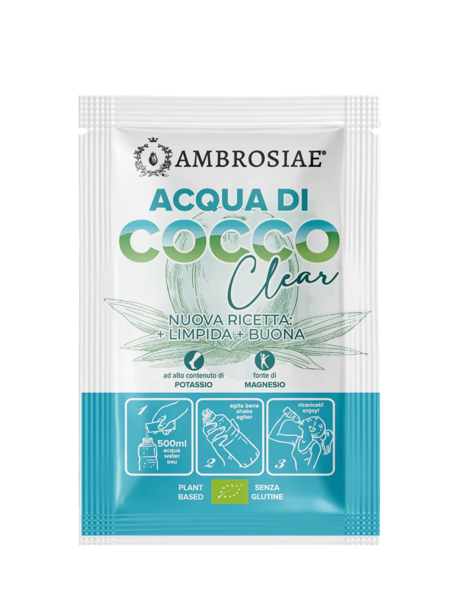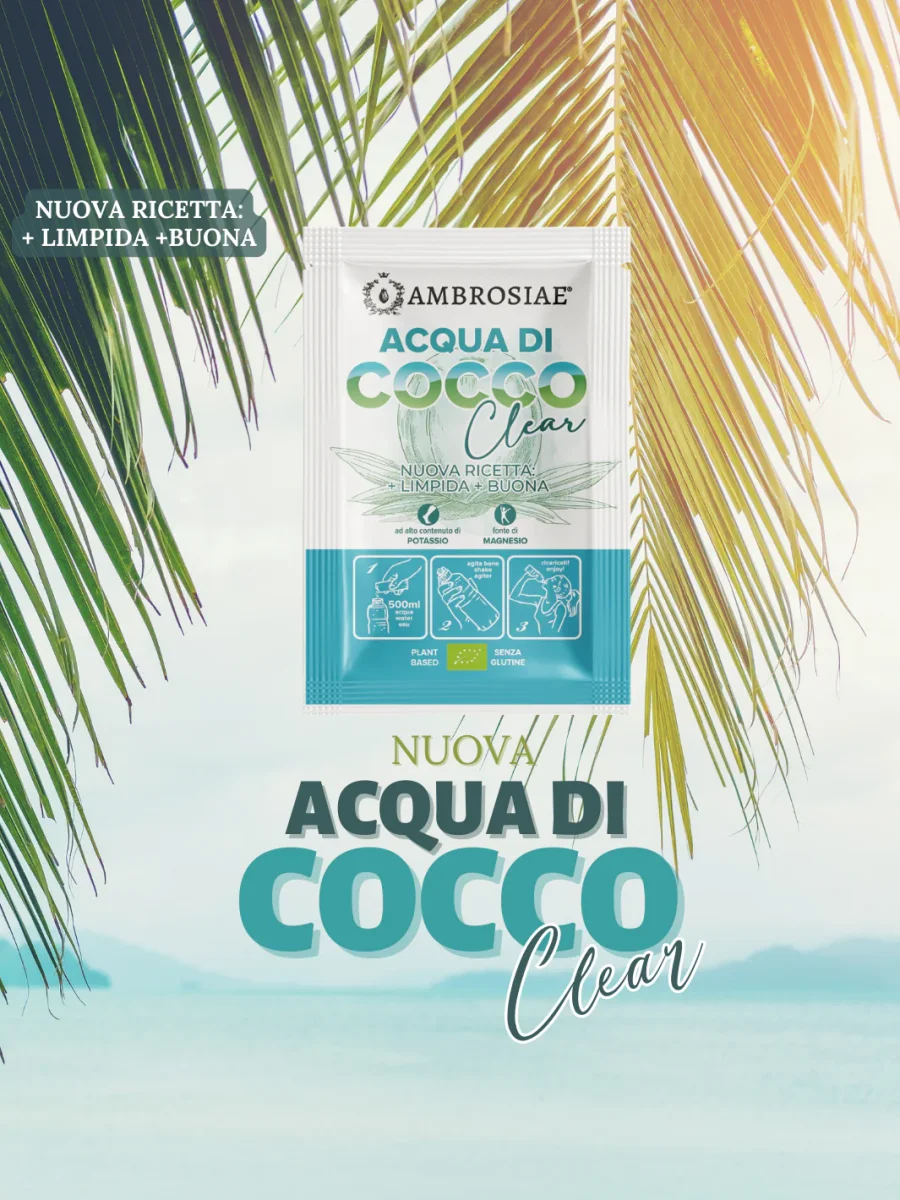 L’acqua di cocco Ambrosiae è l’acqua contenuta all’interno delle noci di cocco giovani e verdi, noi ne abbiamo creato una versione tascabile, disidratata a freddo -freeze dried – in pratiche bustine monodose.