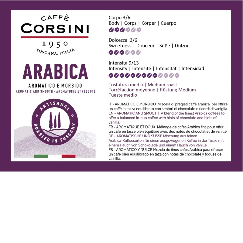 Miscela di caffè arabica con note di caramello e cioccolato.