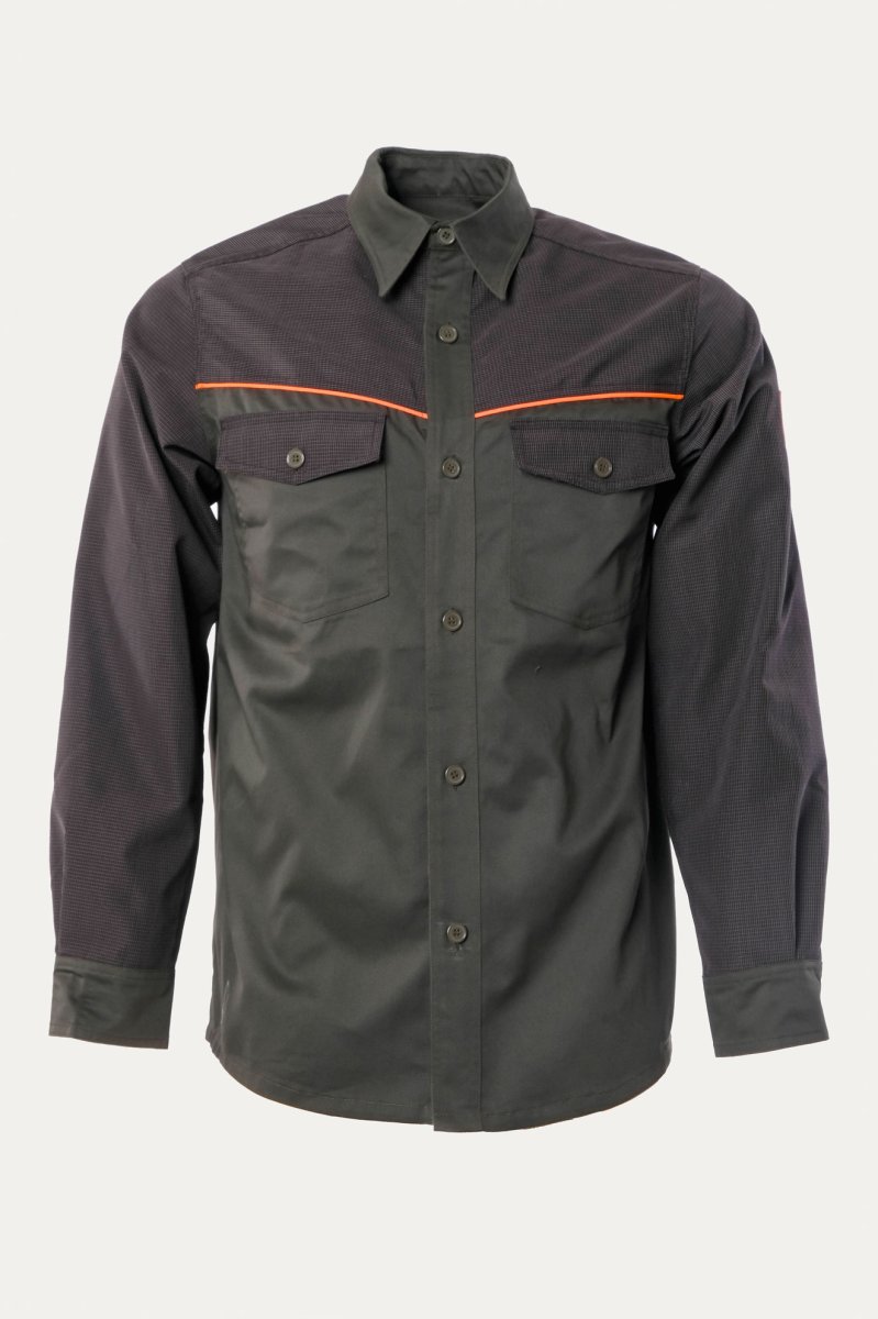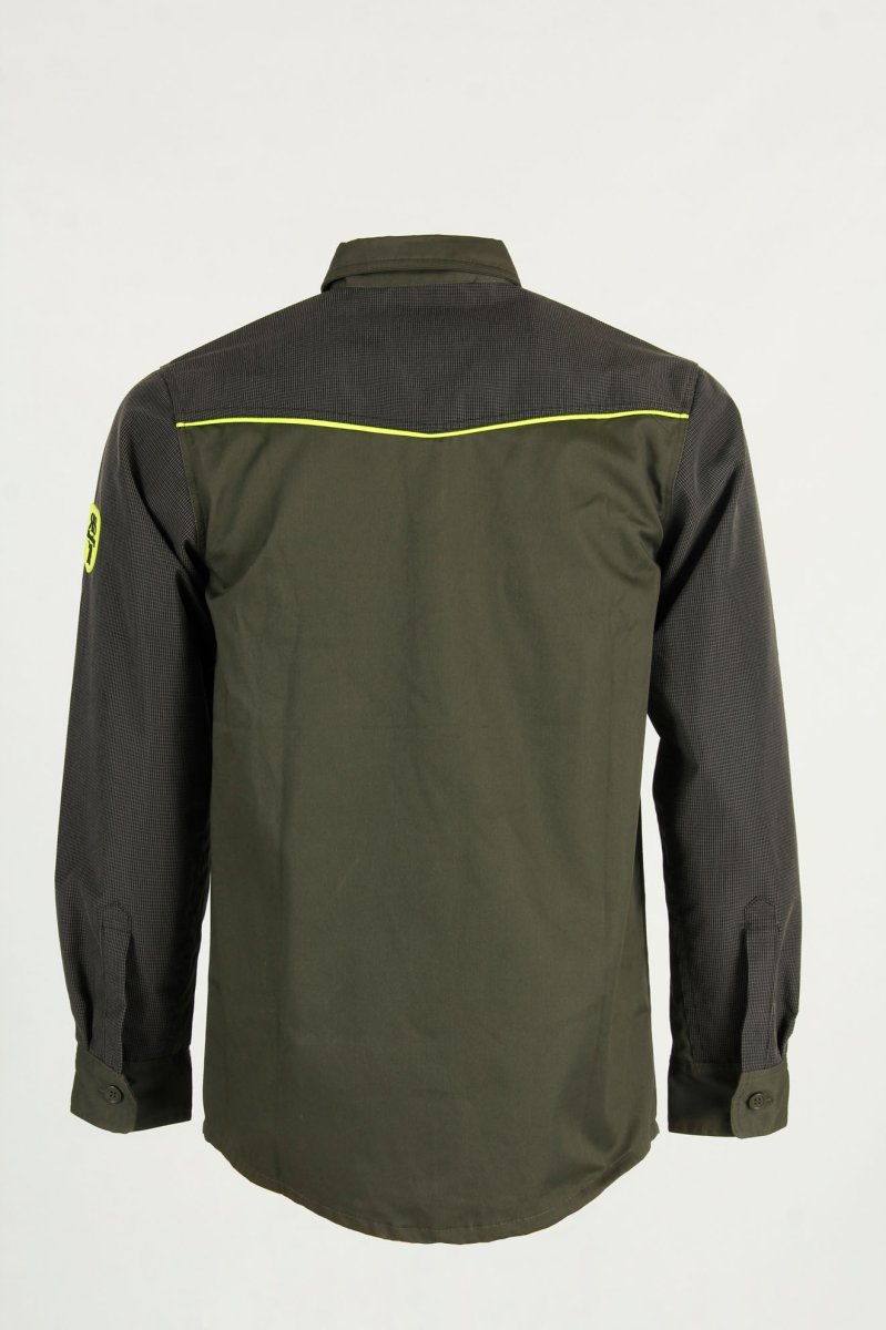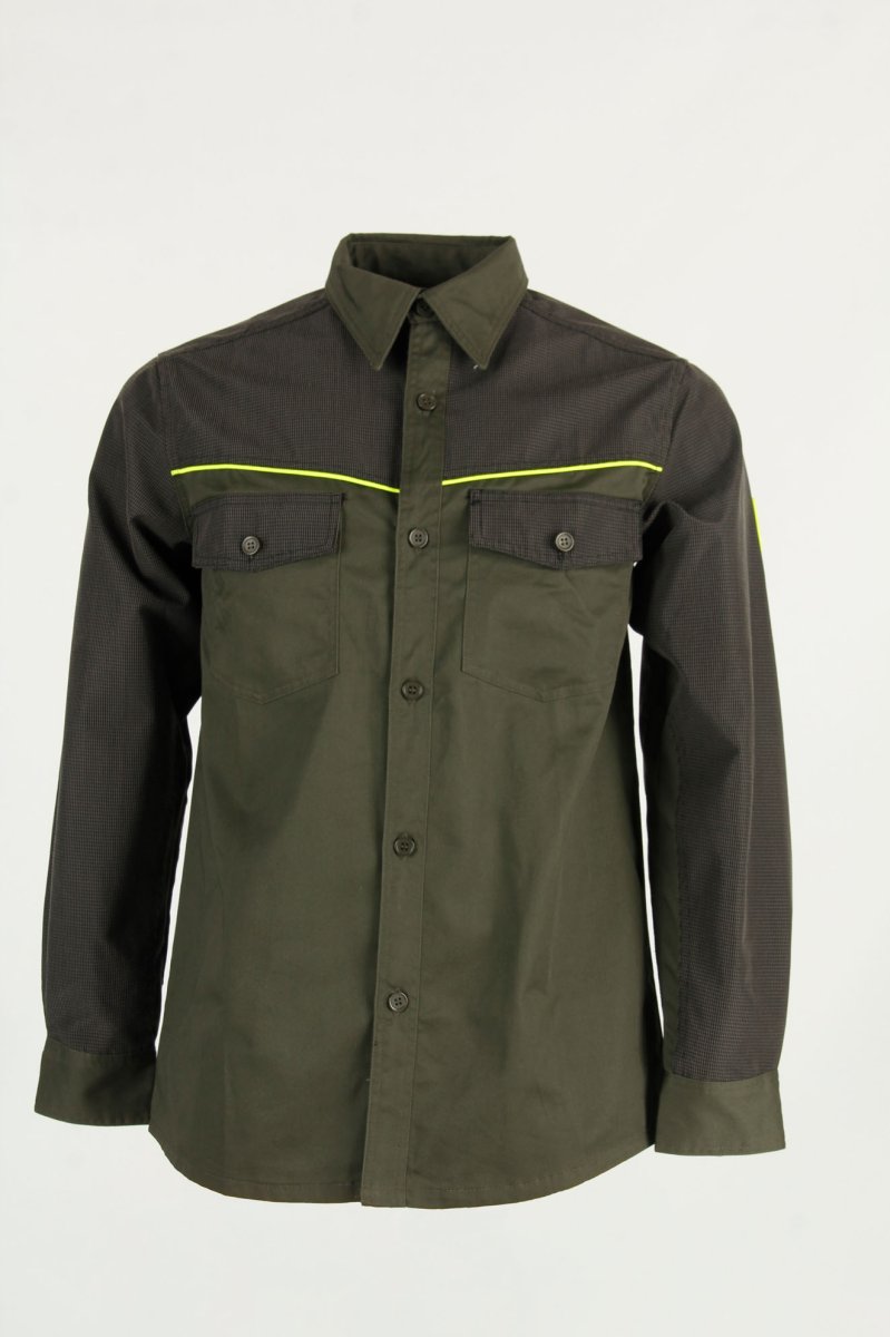‌Camicia da caccia verde, leggero e resistente, per tutti i tipi di uso. Con rinforzi in tessuto tecnico impermeabile e anti spino. Due comode tasche con bottone. Disponibile nelle varianti verde con dettagli alta visibilità giallo o arancione.