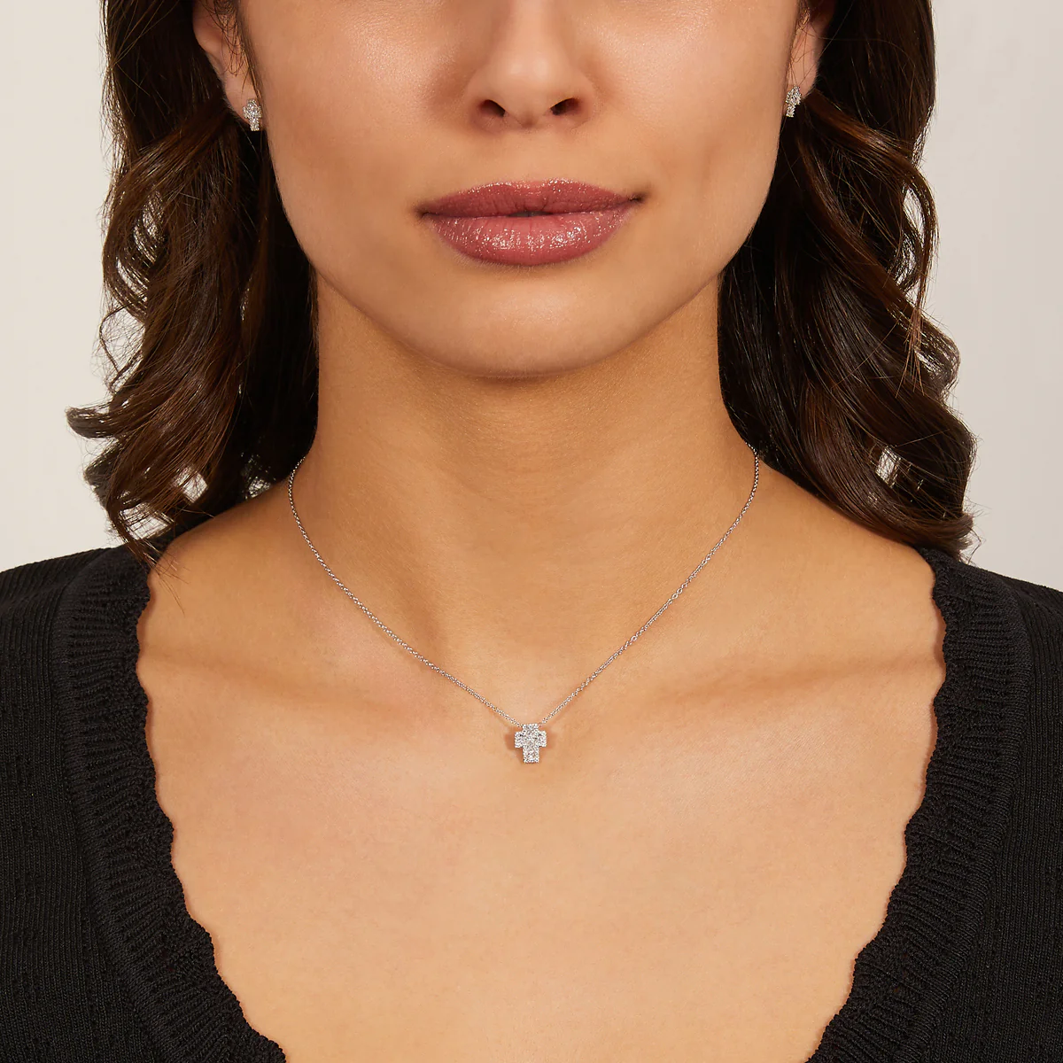 Collana in argento 925 rodiato con croce pendente di zirconi bianchi centrali taglio carré e bordo di zirconi bianchi taglio rotondo. Dimensioni del pendente: 1 cm x 8 mm. Lunghezza della catena regolabile da 40 a 45 cm con allungo e chiusura a moschettone.
