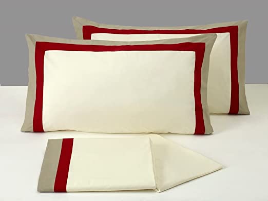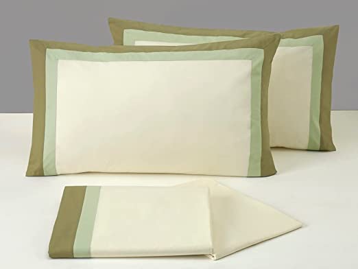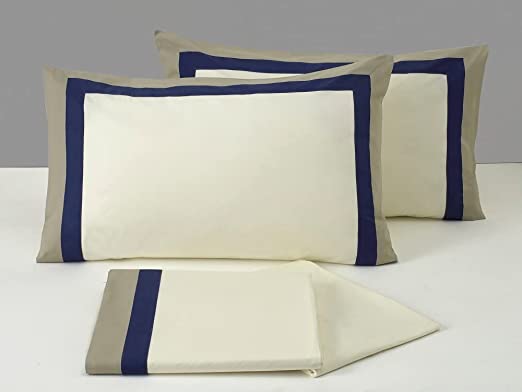 Lenzuolo di sopra impreziosito dal’applicazione alla testa di due bordi di colore e dimensione differente, lenzuolo di sotto con angoli nel colore principale del lenzuolo e delle federe, 2 federe a sacco chiuse con patella, impreziosite dell’applicazione, se tre lati del perimetro del sopra federa, di due bordi di colore e dimensione differente.