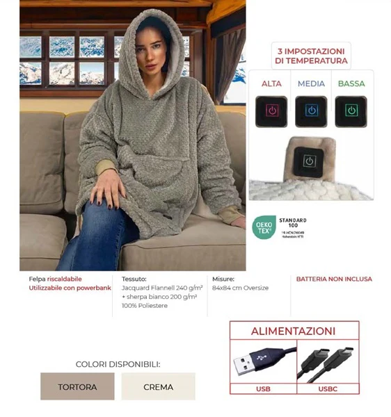 Goditi un’esperienza lussuosa e accogliente con il nostro Felpone riscaldabile Oversize di S&G Home. Realizzato in morbida flanella di alta qualità fuori e sherpa sul retro, ti terrà al caldo durante i mesi invernali. Polsini e grande tasca centrale per essere ancor più comodo e caldo. Con 3 impostazioni di temperatura e il certificato OEKO-TEX, sarà la tua soluzione perfetta per le giornate più fredde. Batteria non inclusa.
