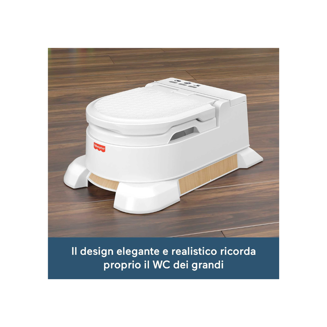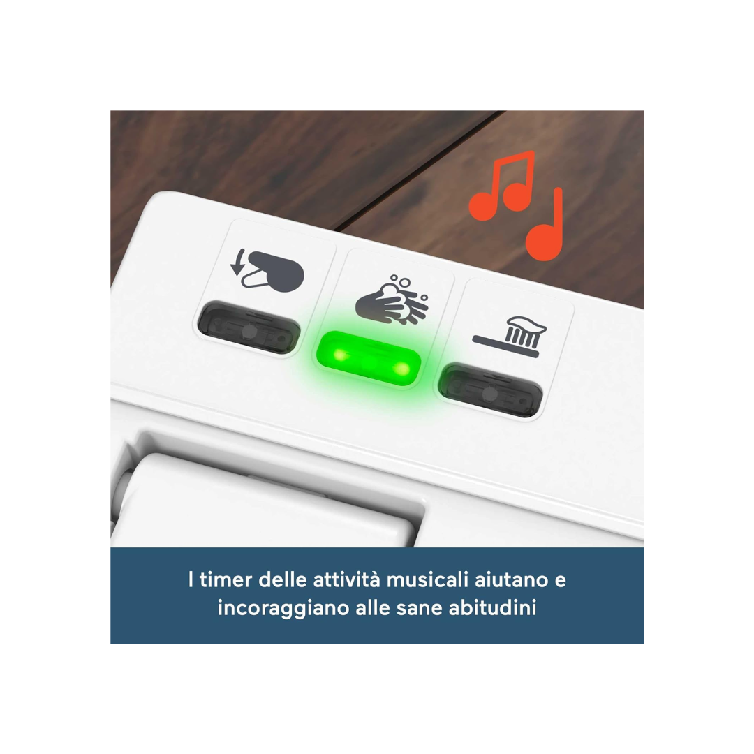 - I pulsanti luminosi attivano suoni realistici dello scarico e timer di attività musicali per seguire la routine di lavaggio di denti e mani;