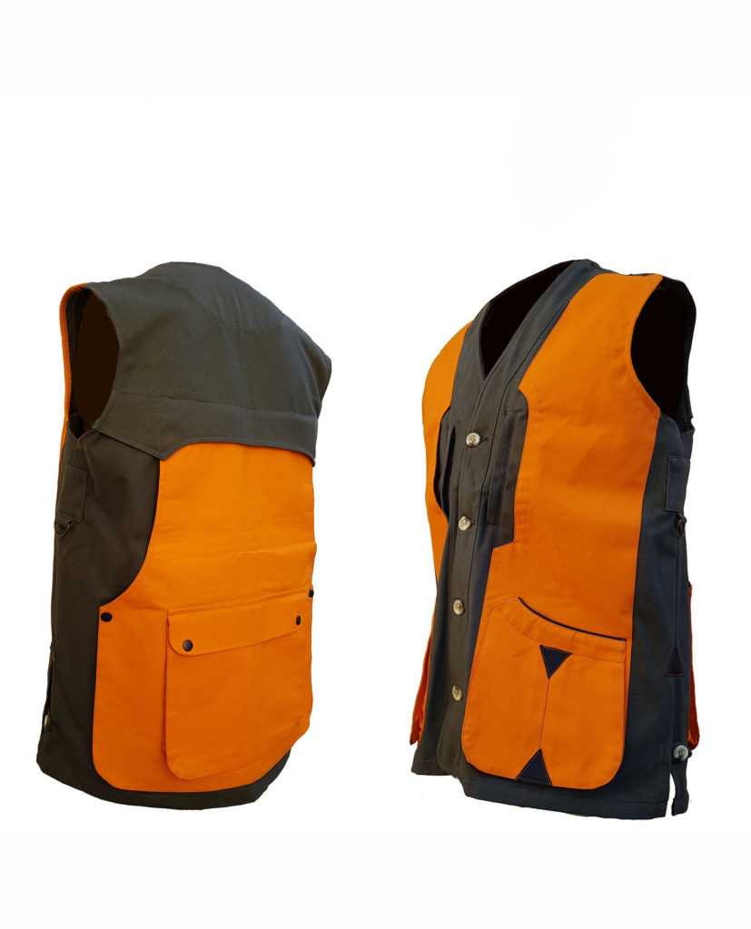 Gilet in canvas molto resistente e cotone cerato blaze orange. Il gilet è strutturato con due tasce anteriori per contenere gli accessori di uso frequente per la caccia, altre due tasche anteriori con zip da destinare a documenti e chiavi auto ed infine due ampie tasce anteriori per materiali ingombranti. Il gilet sul retro presenta un tascapane grande aperto corredato di zip per l’apertura totale ed eventuale pulizia più un secondo tascapane, sovrapposto al primo, chiuso con zip per eventuali prodotti che non devono avere contatto con quanto destinato a contenere il tascapane destinato alla selvaggina. Inoltre il gilet ha anche una piccola tasca interna sul lato sx. Due bottoni laterali consentono di aprire lateramente il gilet ed avere un migliore andamento senza impedimento alle gambe mentre si percorrono sentieri di montagna con pendenze impegnative. Il cotone cerato blaze orange oltre a conferire idrorepellenza garantisce un`ottima visibilità nel bosco e tra la vegetazione.