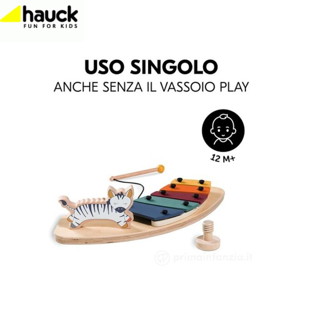 Grazie a questo gioco musicale puoi utilizzare Play Tray con il seggiolone Alpha+, Beta+ o Arketa in modo ancora più versatile, perché offre al bambino la possibilità di allenare tante abilità. Creando suoni con lo xilofono e l’animale, il bambino allena il ritmo musicale e la coordinazione tra percezione visiva e motricità fine. Il vassoio può essere abbinato con diversi giochi hauck, che possono essere acquistati separatamente e sostituiti. Così il bambino allena contemporaneamente diverse abilità. Per evitare che qualcosa si sposti o cada a terra, puoi fissare il gioco al vassoio Play Tray utilizzando la vite di legno in dotazione. In alternativa, puoi utilizzare il gioco musicale anche senza Play Tray e portarlo da amici, familiari o in vacanza. Il regalo perfetto per bambine e bambini dai 12 mesi.