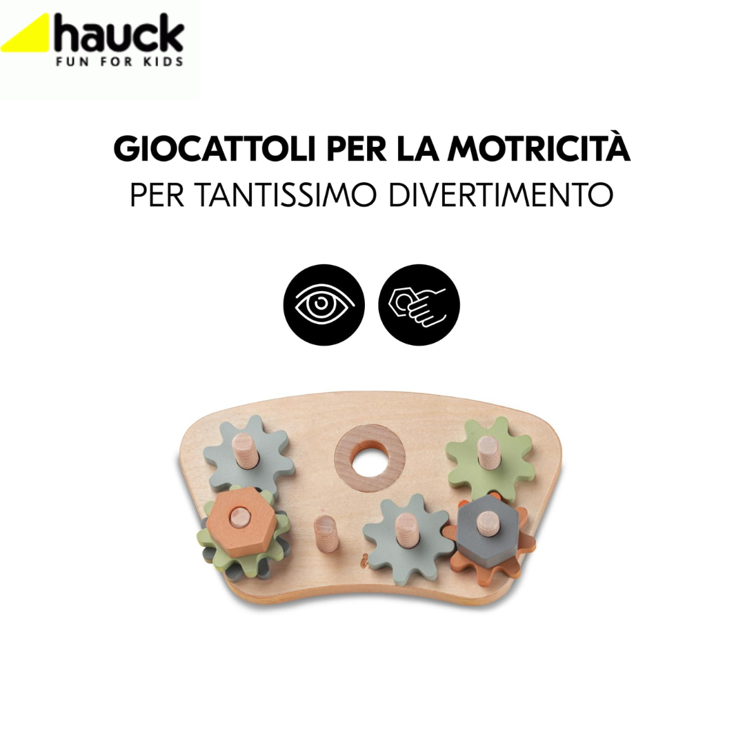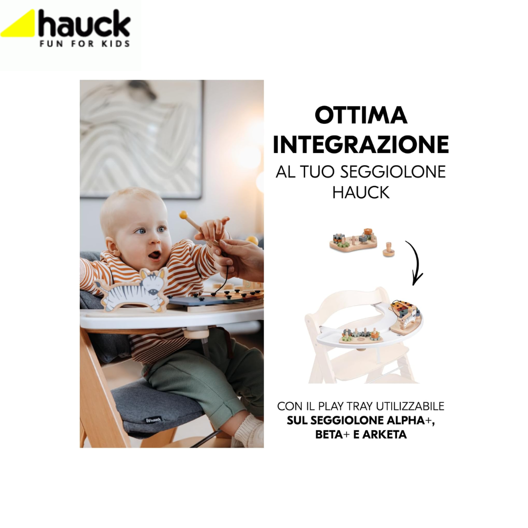 - Il vassoio gioco legno può essere abbinato a un massimo di tre set gioco hauck, che possono essere acquistati a parte e sono intercambiabili, così il bimbo allenerà diverse abilità.