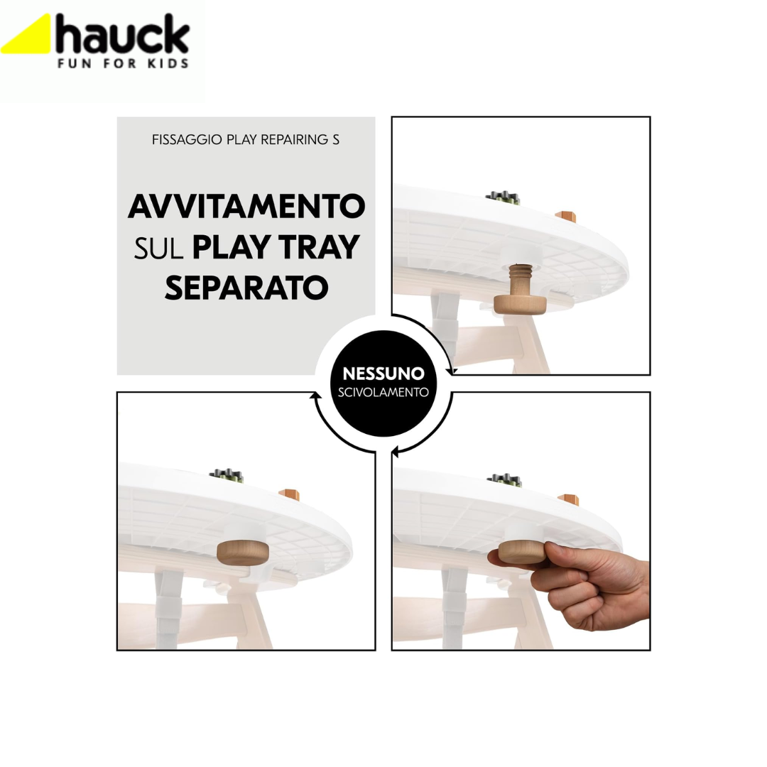 - E’ possibile avvitare facilmente il gioco legno per bambini al seggiolone hauck utilizzando la vite in legno in dotazione. In questo modo il giocattolo non può cadere.