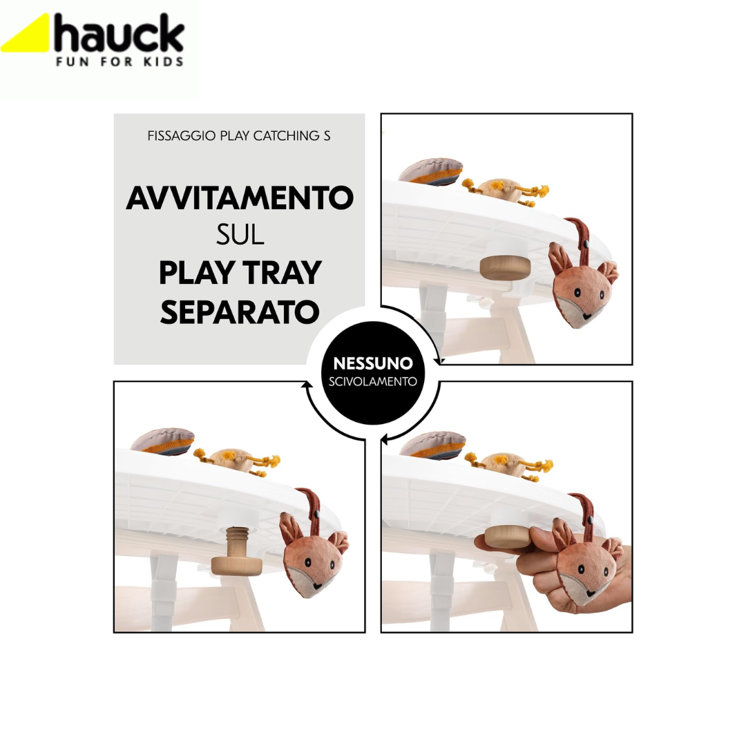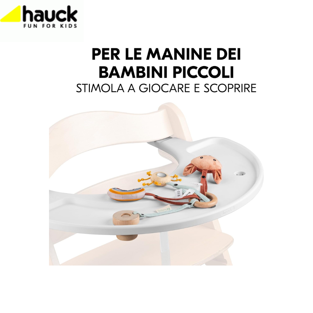 - E’ possibile avvitare facilmente i sonagli neonato al seggiolone hauck utilizzando la vite in legno in dotazione. In questo modo il giocattolo non può cadere.