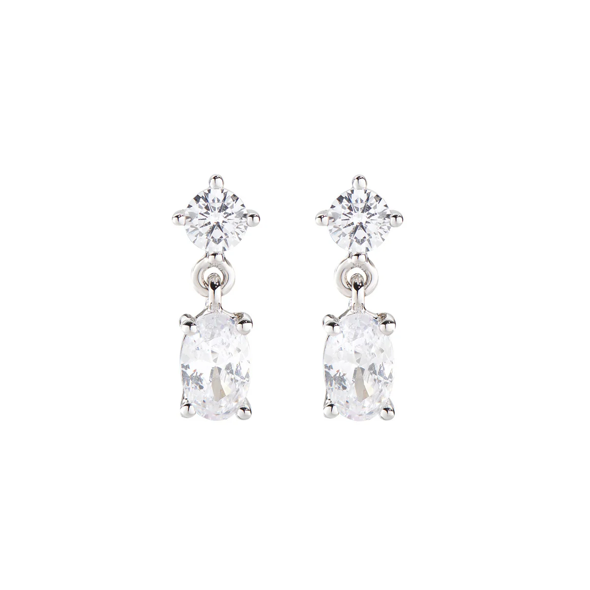 Orecchini pendenti in argento 925 rodiato con zircone bianco punto luce da 3,5 mm e zircone pendente taglio ovale di 3 x 5 mm. Lunghezza totale: circa 1,5 cm. Chiusura con perno e farfallina.