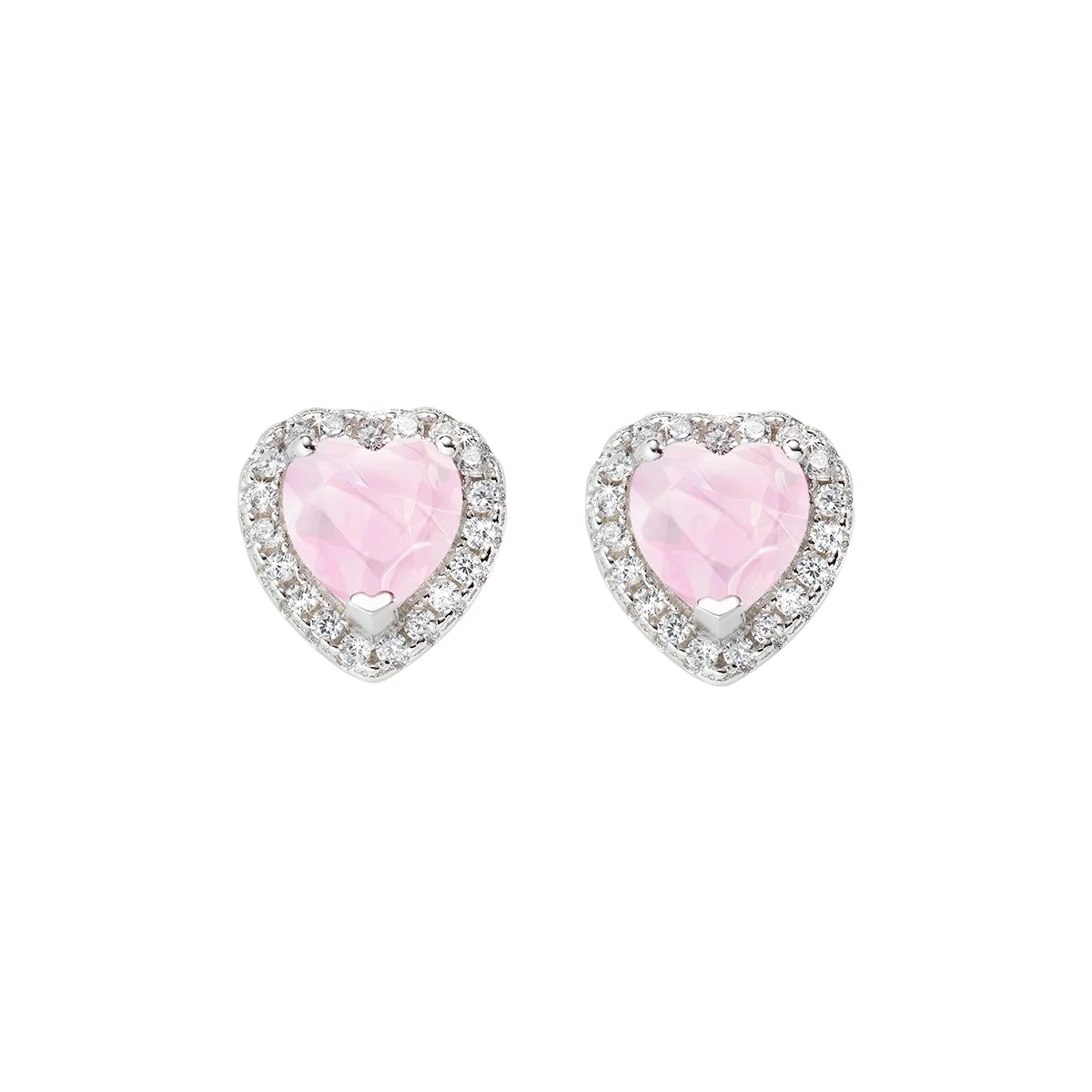 Orecchini a lobo a forma di cuore in argento 925 rodiato. Zircone rosa centrale taglio cuore di 6 mm con corona di zirconi bianchi. Dimensioni totali dell’orecchino: 9 x 9 mm. Chiusura con perno e farfallina.